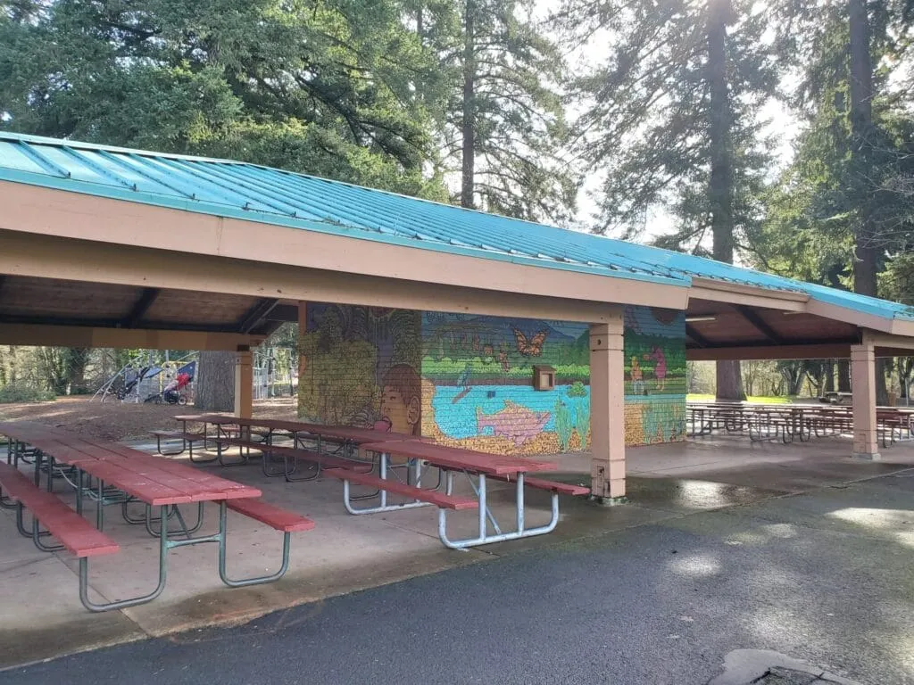 The Main Shelter in Tualatin Community Park has electrical outlets, a drinking fountain and sinks in the restrooms.