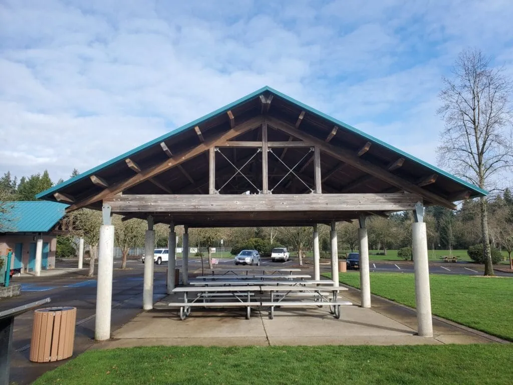 The Main Shelter at Tualatin Community Park is the only shelter with an attached restroom. Ibach Park, Jurgens Park, and Atfalati Park have restrooms nearby.